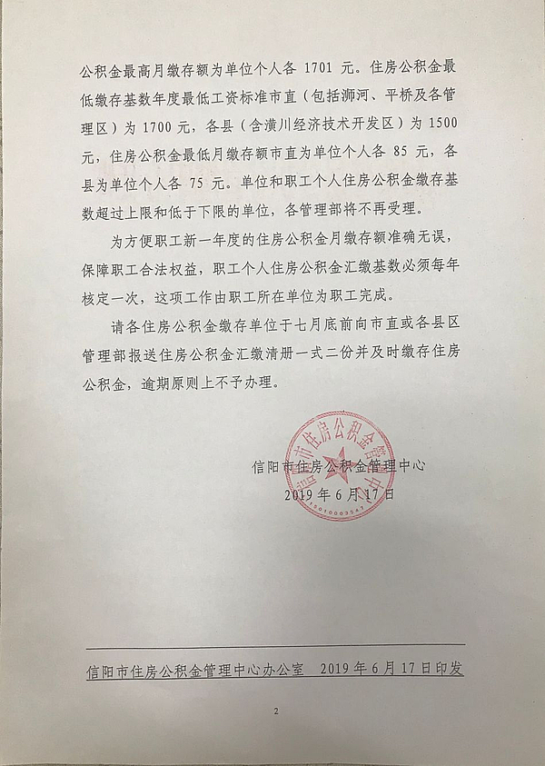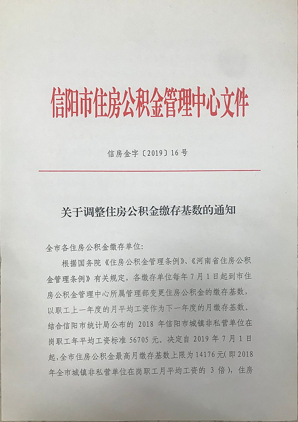 根据国务院《住房beat365官网下载_365betribo88_农村365今日头条主页管理条例》、《河南省住房beat365官网下载_365betribo88_农村365今日头条主页管理条例》有关规定,各缴存单位每年7月1日起到市住房beat365官网下载_365betribo88_农村365今日头条主页管理中心所属管理部变更住房beat365官网下载_365betribo88_农村365今日头条主页的缴存基数,以职工上一年度的月平均工资作为下一年度的月缴存基数。结合信阳市统计局公布的2018年信阳市城镇非私营单位在岗职工年平均工资标准56705元。决定自2019年7月1日起,全市住房beat365官网下载_365betribo88_农村365今日头条主页最高月缴存基数上限为14176元(即2018年全市城镇非私营单位在岗职工月平均工资的3倍),住房beat365官网下载_365betribo88_农村365今日头条主页最高月缴存额为单位个人各1701元。住房beat365官网下载_365betribo88_农村365今日头条主页最低缴存基数年度最低工资标准市直(包括浉河、平桥及各管理区)为1700元,各县(含潢川经济技术开发区)为1500元,住房beat365官网下载_365betribo88_农村365今日头条主页最低月缴存额市直为单位个人各85元,各县为单位个人各75元。单位和职工个人住房beat365官网下载_365betribo88_农村365今日头条主页缴存基数超过上限和低于下限的单位,各管理部将不再受理。