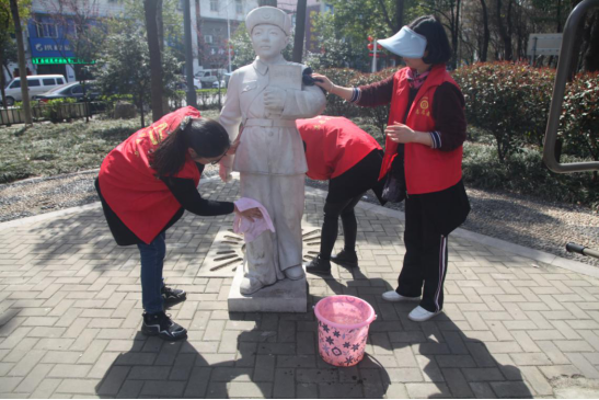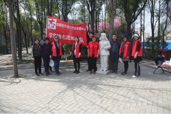 3月15日下午,和煦的阳光和袅袅的白云映衬着志愿者鲜艳的旗帜和火红的衣裳。中心志愿者们来到浉河南岸雷锋林,仔细对各座雷锋塑像进行了清洗。